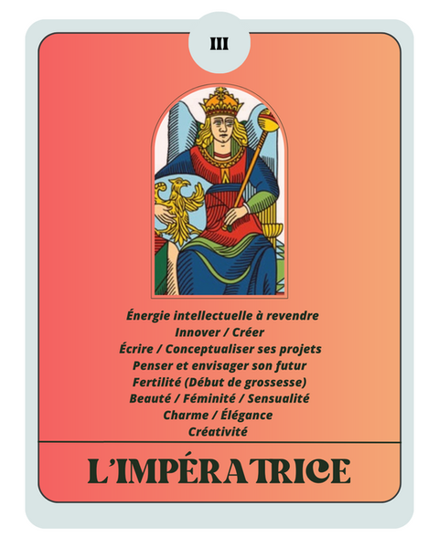 La Papesse transmet les premières connaissances, c'est l'éducation qui se met en place, ce qui apporte une sécurité affective, avec l’impératrice, la figure maternelle, qui éduque, qui materne et qui protège. Le développement du jeune enfant évolue : son imagination se débride, il commence à avoir des idées, il conçoit, c'est l'émergence de sa pensée créatrice. Avec son père, l’Empereur, il concrétise ces idées.